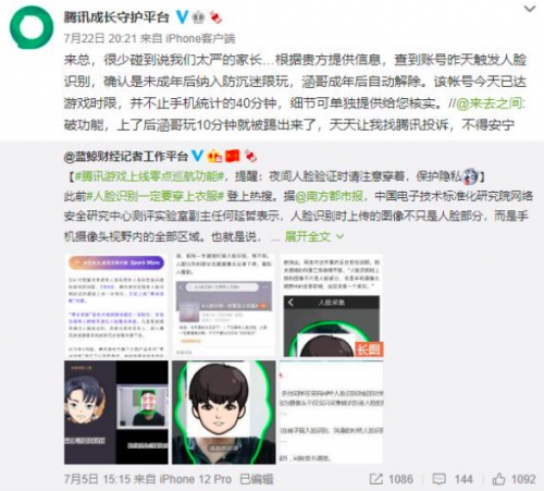 就在近日,微博CEO王高飞在微博点名腾讯零点巡航功能,吐槽改功能严格限制了孩子的游戏时间,自己的孩子游戏不到10分钟就被强制下线,后来发现原来是游戏在手机后台运行了40分钟,才导致孩子游戏时间不到10分钟就被迫下线,认为腾讯的这个设定很不合理,是一个BUG。