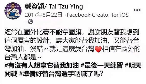 在自己的社交平台上,戴资颖几乎是明确表示自己是为台湾而战,与大陆没有关系,台湾是另一个国家。