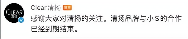 清扬洗发水宣布与小S的合作到期结束。
