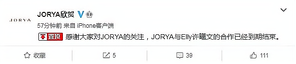 服装品牌JORYA宣布与小S大女儿许曦文的合作到期。