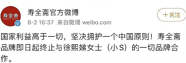 寿全斋发布声明:寿全斋品牌即日起终止与徐熙娣女士(小S)的一切品牌合作。