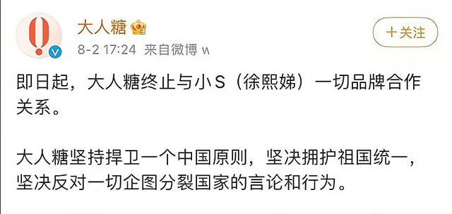 几个月前小S刚签约的大人糖宣布与其解约。