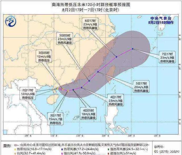 据悉,南海热带低压于8月2日下午5点钟在广东湛江东部近海海面上生成,中国气象台 预计,该低压最强可达热带风暴级或强热带风暴级,将于5日擦过或登陆福建中部沿海。