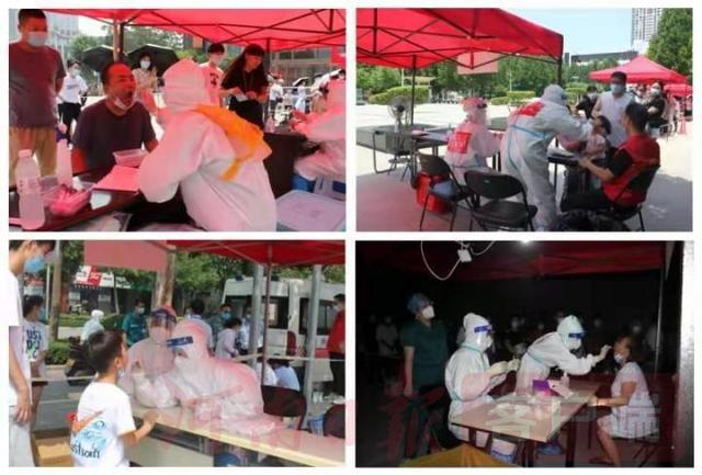 天气炎热,比天气更热的,是医护人员和人民群众共同抗疫、守护美好家园的信心。一名5岁的孩子摘下口罩,先说一声“谢谢”,才张口采集标本;一名3岁男孩,奶声奶气地说:“叔叔阿姨辛苦了,我好心疼你们!”让医护人员不禁掉下了眼泪;社区工作人员热情为没有智能手机的老年人登记健康信息、流动采集组为不方便的老人上门服务......党旗飘扬在现场,志愿红与党旗交相辉映,将全力保障人民群众生命健康的初心和使命扛在肩上,通航之都处处是织密防控网的决心和力量。