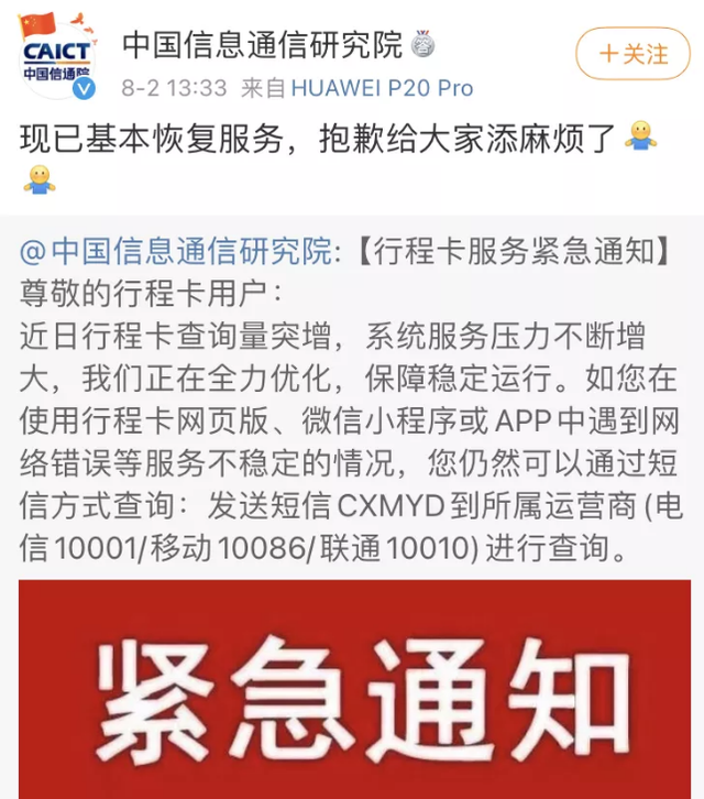 对此,8月2日@中国信息通信研究院 在微博上回应称,因近日行程卡查询量突增,系统服务压力不断增大,如出现不稳定现象可发送短信进行查询。当天下午13:33,@中国信息通信研究院