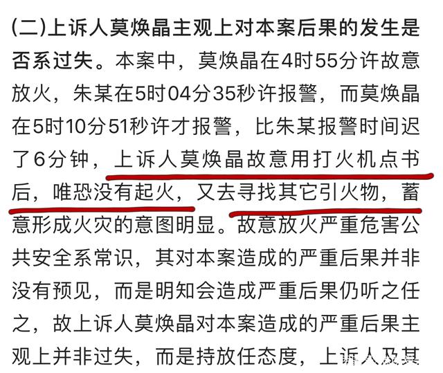 放火杀人都是重罪,这是一个基本常识,一个人但凡去做这些事,一定是酝酿很久了,并不会临时起意,一个人心理上不做好准备他没有这个胆量,肯定是先做好了谋划,然后再去实施。这也是莫焕晶放火后还能在目击现场临危不乱的原因,因为一切都是按计划行事。