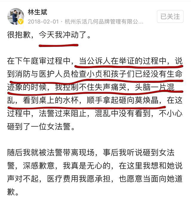 而林生斌的律师庭审后接受采访也是支支吾吾,被问及林生斌为什么会情绪激动地向莫丢杯子时,他居然说:这个你们自己想吧。显然并非林生斌所描述的那样,那林生斌是不是在说谎逃避呢,不是更显得此地无银三百两吗?