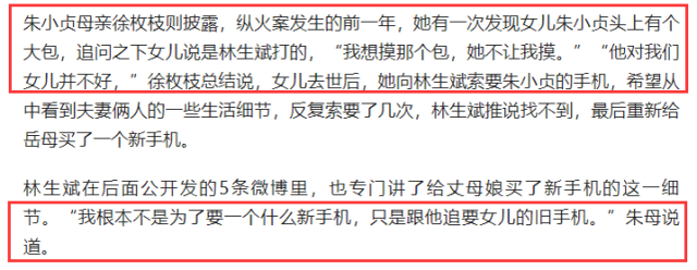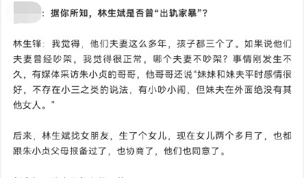 但是针对朱家父母此说法,林生斌的大哥受访表示了否认,他强调夫妻之间有吵架很正常。哥哥还称,朱小贞的哥哥在出事后不久,也曾受访透露,不存在第三者的说法,两人有小吵小闹,但林生斌在外面绝对没有其他女人。