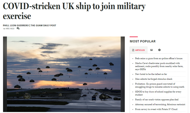 美国安德森空军基地司令杰里米·斯隆准将于8月1日表示,这些英国军舰将“在未来几周内”抵达关岛港口。这也将是“伊丽莎白女王”号航母首次访问关岛。