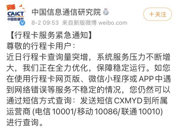 对此,昨天@中国信息通信研究院 在微博上回应称,因近日行程卡查询量突增,系统服务压力不断增大,如出现不稳定现象可发送短信进行查询。