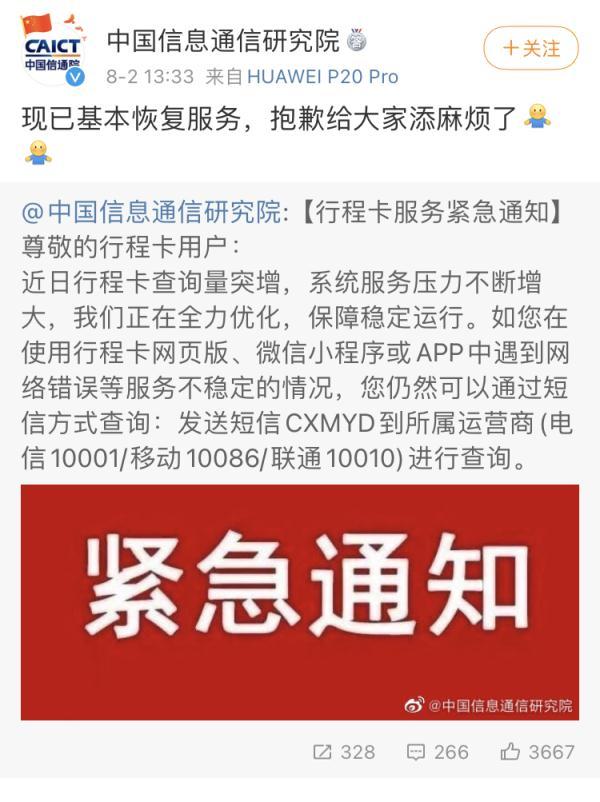 发微博表示行程卡已基本恢复服务。