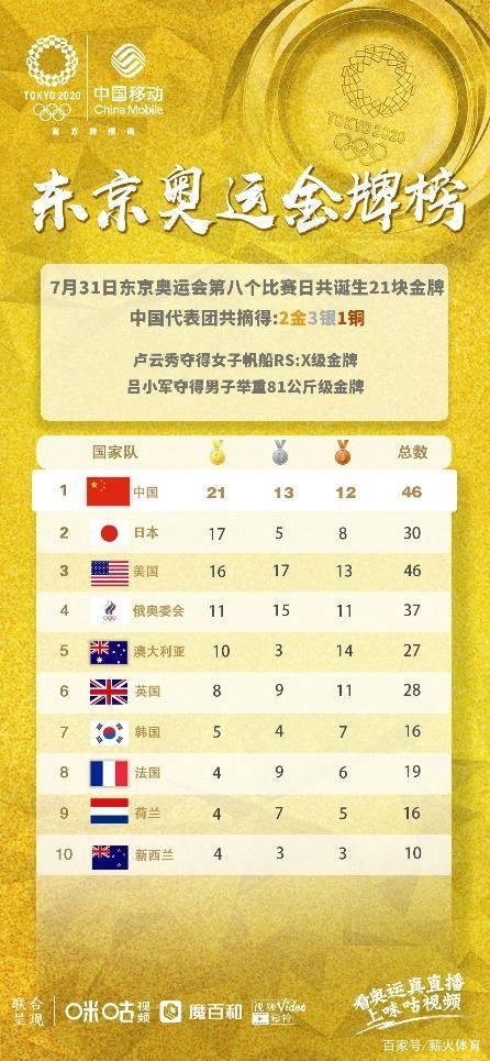 【摘要】 北京时间7月31日,在东京奥运会第八个比赛日的争夺中,中国代表团共获得2金3银1铜,暂列金牌榜首位。中国帆船帆板队斩获1金1铜,卢云秀获得