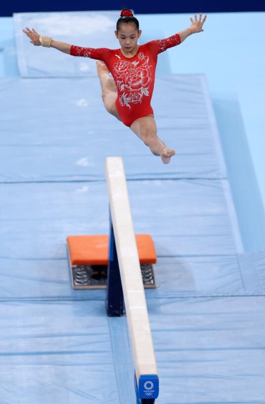 3 日,在东京奥运会体操项目女子平衡木决赛中,中国选手管晨辰夺得冠军,唐茜靖获得亚军。图为管晨辰在比赛中。新华社发