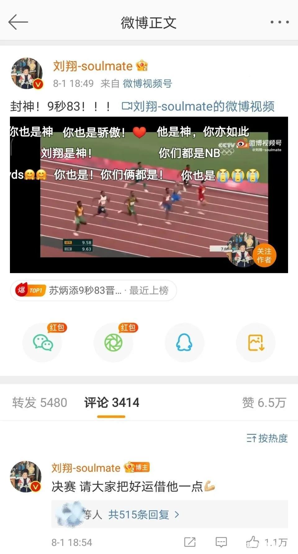 刘翔在苏炳添进入决赛之后发了一条祝贺微博: