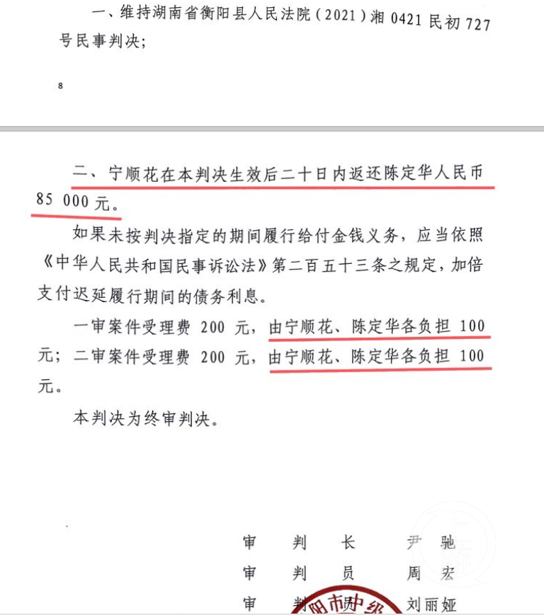 8月3日中午,上游新闻记者从宁顺花代理律师曹远泽处获悉,3日中午,他收到衡阳市中院邮寄来的终审判决书:维持准予双方离婚的原判决,并判决宁顺花返还男方陈定华彩礼、红包85000元。