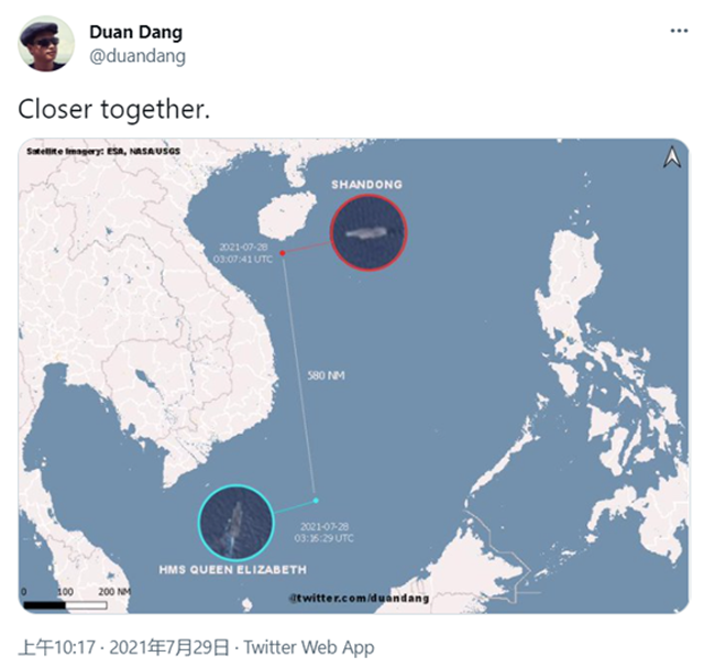 美国“动力”网站“战区”专栏难掩兴奋,在报道中称,“中英两国航母都在局势紧张的南海航行”,并附上“同框”卫星图,称英国“伊丽莎白女王”号航母编队正在南海,而解放军的航母山东舰也在同一海域活动。