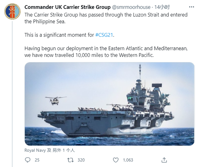 8月1日,英国航母打击群官方推特发布消息,称该航母编队已经经过吕宋海峡,离开南海进入菲律宾海。还不忘给自己脸上贴金,称这是“伊丽莎白女王”号航母首次执行远航任务,“显示英国可在印太地区为盟友级伙伴提供一个可靠的航母战斗群,准备好为海上安全做出贡献”。