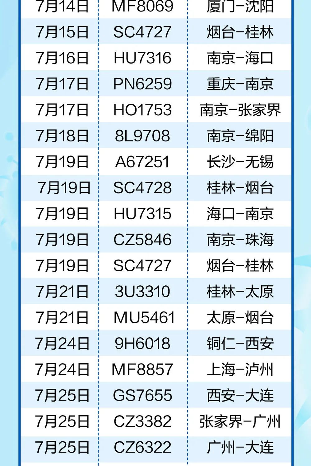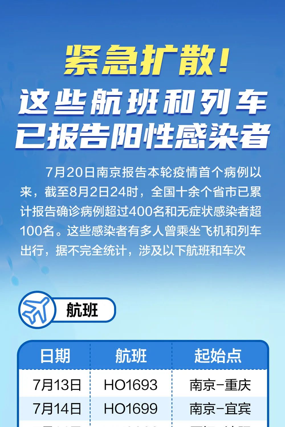 8月3日,在北京市新型冠状病毒肺炎疫情防控工作第230场新闻发布会上,中国铁路北京局集团有限公司疫情防控办公室客运组主任崔巍介绍,铁路部门决定对郑州、南京、扬州、沈阳、大连、淮安、宿迁、厦门、商丘、黄冈、荆州、长沙、株洲、湘潭、张家界、益阳、湘西州、海口、成都、泸州、绵阳、宜宾、德宏州共23个地区车站出发的旅客采取限制进京防控措施,暂停发售到达北京地区车站的车票。 8月3日,湖南张家界市发布新冠肺炎疫情防控工作指挥部令:即日起,在张家界境内的居民、游客等所有人员不得离开张家界,积极配合做好疫情防控工作。 紧急扩散! 7月14日乘坐过 厦门----沈阳的航班MF8069的 请上报! 该航班已报告阳性感染者! 还有乘坐过这些航班和列车 也要当心了! 疫情当前, 速自查, 不瞒报!