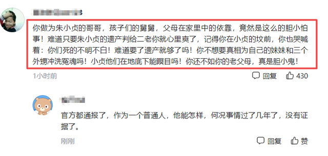 相比朱舅舅的淡定和沉着,一些网友们情绪显得非常激动。竟然开始埋怨起朱庆丰,隔空喊话道:“你作为朱小贞的哥哥,孩子们的舅舅,父母在家里中的依靠,竟然是这么的胆小怕事!难道只要朱小贞的遗产判给二老你就心里爽了,记得你在小贞的坟前,你也哭喊着你们死得不明不白!难道要了遗产就够了吗?你不想要真相为自己的妹妹和三个外甥冲洗冤魂?小贞他们在地底下能瞑目?你还不如你的老父母,真是胆小鬼!”