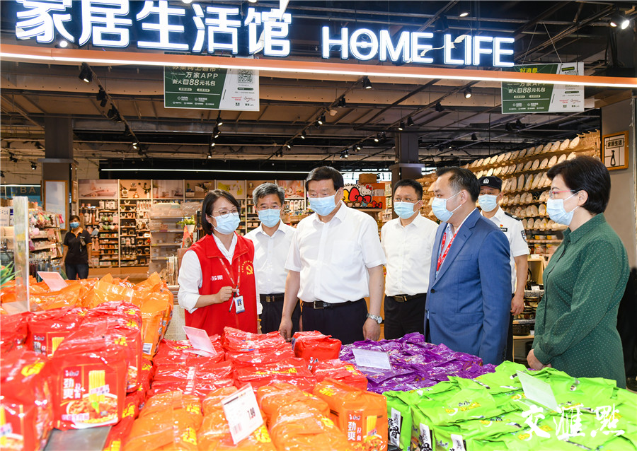 娄勤俭在南京市栖霞区华润苏果亚东店检查疫情防控和超市生活物资保供情况。