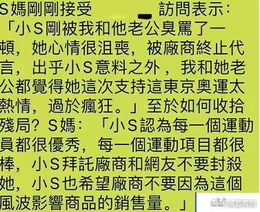 8月1日晚,东京奥运会羽毛球女单冠军争夺赛,内地选手陈雨菲2比1战胜了台北选手戴资颖,获得金牌。 在大家都为陈雨菲欢呼的时候,小S的迷惑行为却引起了热议。 # 支持tai 独选手? 小S在社交平台ins上发布了这样一条言论,她说“虽败犹荣,但我差点暴毙”,然后配上台北选手戴资颖的照片。这番言论引起了内地网友的不舒服。 这句话本身并没有太大问题,但是大多数人潜意识都认为无论内地选手还是台湾选手,说到底是属于一家人,彼此之间并不存在谁赢谁输的情况。 随后有网友扒出,戴资颖曾发表tai 独言论。 而且,小S也不是第一次发表这类容易引起歧义的言论。 在半决赛的时候,戴资颖获胜,当时小S就有留言:“我老公说,要请全部‘国手’到家里吃饭。” 就是这个“国手”二字,将小S推到了风口浪尖。因为,小S口中的“国手”,指的是台湾的选手,而不是台湾和内地所有的选手,引起了网友的不满。 小S也曾给另外一名羽毛球男选手李洋点赞。 而这名男选手也曾极端发言称台湾为国家。 # 品牌迅速解约 舆论迅速发酵后,已有四大品牌纷纷与小S及其女儿Elly解约。媒体统计,小S至少已损失代言费用3200万新台币(约740万人民币)。 就连六月份刚刚官宣合作的“大人糖”,也表示与小S终止合作。 小S对此的回应是“先让我静一静好吗”。 小S的妈妈在接受采访后表示,已经将小S臭骂了一顿。小S拜托厂商和网友们不要封杀她。 学姐发现,引起网友攻击小S的焦点是其立场摇摆。一方面,她曾在节目中表示自己是中国人,并且在中国内地也较为活跃。 另一方面,此次关注奥运选手的她,仅在ins发言庆祝,微博上未有表示。而且多处疑似td的发言被质疑后,没有及时、明确地重申自己的立场。 # 台湾艺人,何去何从 提起小S,逃不过的词是“康熙来了”。 这档已经停播五年、共计2600多集的综艺,在多少人心中封神,留下爆笑回忆。 因此,即便停播,小S这些年在内地的口碑还是相当不错。 而且和绝大多数台湾艺人不同,网友对于这位作风大胆甚至是口无遮拦的女星宠爱有加。 小S当年调戏过的男星名字连起来可以出书了。 谁能想到粉了这么久的敢说敢做的女明星,一夜之间成了tai 独呢?不少粉丝表示非常震惊,也有人试着帮她解释。 毫无疑问,网友们为此争论不休。 不过,仅一天时间,各大品牌就纷纷官宣解约,速度之快、态度之坚决,让人感觉娱乐圈似乎发生了一些变化。 想来莫不是某吴姓艺人,以一己之力,“破”开娱乐圈的遮羞布之后,引起了众人的警惕与自危。 微博官方清理有关吴的相关超话、群组 其实,对于台湾人民处于文化和政治撕裂的情况,学姐是很同情的。不过在这样敏感的环境下,犯了错也必然要付出一些代价,希望其他艺人也能以此为鉴,谨言慎行吧。