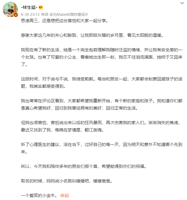 至于林生斌是否涉嫌偷税漏税,目前还没有调查结果,相信后续调查结果会在公布后公布。其实仔细想了想,这个公告与其说是对林生斌事件的制止,倒不如说是和大家想象的有些不一样。 6月30日,林生斌开心地爱着女儿,还晒出了女儿的照片。