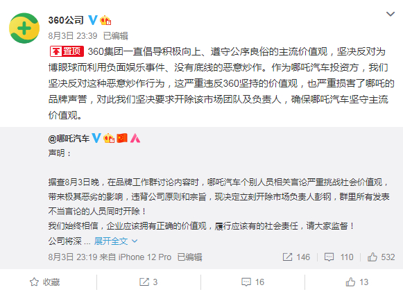 在此之后,360公司转发哪吒汽车上述声明并表示,公司一直倡导积极向上、遵守公序良俗的主流价值观,坚决反对为博眼球而利用负面娱乐事件、没有底线的恶意炒作。作为哪吒汽车投资方,公司坚决反对这种恶意炒作行为,这严重违反360坚持的价值观,也严重损害了哪吒的品牌声誉,对此公司坚决要求开除该市场团队及负责人,确保哪吒汽车坚守主流价值观。