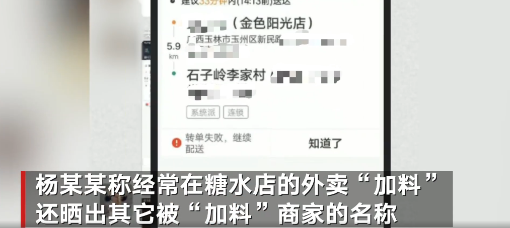 8月3日,广西玉林一名外卖员杨某某自称曾在奶茶、糖水中加“老鼠屎”和“尿液”,撕开封口加料后,自己支付费用找奶茶店重新封口。杨某某提到的一家曾“加料”的糖水店,曾被顾客投诉“有馊味”。该外卖平台回复称,杨某某已离职,目前警方正开展调查。