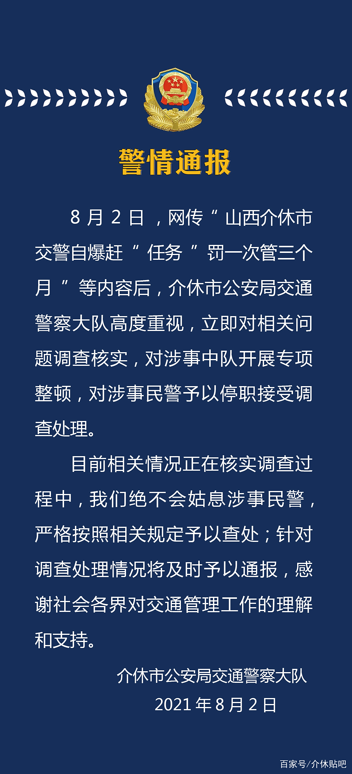 8 月 2 日 ,网传“山西介休市交警自爆赶“任务"罚一次管三个月”等内容后,介休市公安局交通