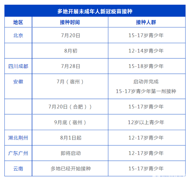目前,多地已经开放对青少年接种新冠疫苗,小帮主将其汇总如下: