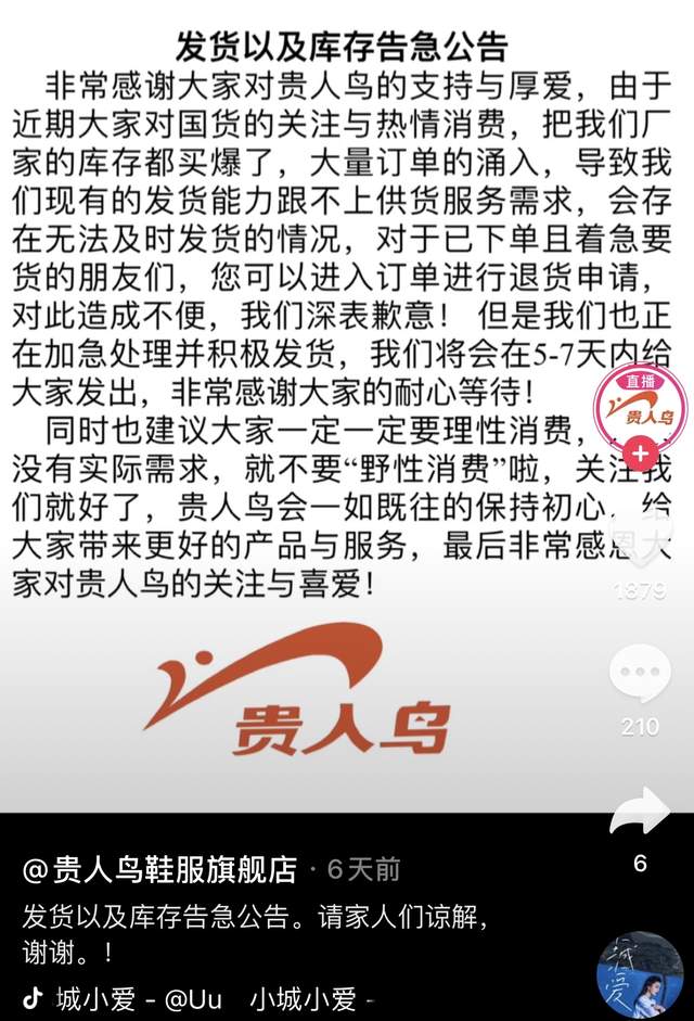 由于销量太过火爆,贵人鸟很快和鸿星尔克一样库存告急。7月27日,贵人鸟通过抖音号告知消费者,公司现有的发货能力已经跟不上供货服务需求,并建议大家不要“野性消费”。