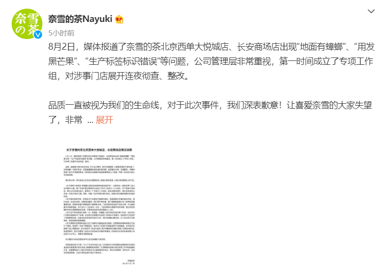 近日,新华社记者“卧底”网红奶茶店“奈雪的茶”,发现其多家分店存在蟑螂乱爬、水果腐烂、抹布不洗、标签不实等问题。 记者应聘进入“奈雪的茶”北京西单大悦城店,上岗当天,记者看见一只指甲盖大小的蟑螂,从面包展柜底部爬向面包制作间。记者马上报告同组值班店员,但得到“没事,不用管它”的答复。 “水吧和面包房有蟑螂”在许多店员看来十分“正常”。入职第二天,一些店员告诉记者,虽然店里要求很高,但“忙起来就顾不上那么多了”。 在“奈雪的茶”长安商场店,一些发黑的芒果摆放在后厨的桌子上,员工被提醒要去掉“黑色”部分继续使用,“不要浪费,稍处理一下即可”。 记者看到,一些标签纸等杂物不小心掉进芒果泥里,杂物被挑拣出来后芒果泥继续使用。 一款“软欧包魔法棒”系列产品,按要求应在4小时内售完。但一些员工会将未售完的产品及时更改时间标签再卖。 8月3日,奈雪的茶Nayuki通过官方微博发表致歉声明称,媒体报道了奈雪的茶北京西单大悦城店、长安商场店出现“地面有蟑螂”、“用发黑芒果”、“生产标签标识错误”等问题,公司管理层非常重视,第一时间成立了专项工作组,对涉事门店展开连夜彻查、整改。 食品产业专业人士指出,奈雪的茶作为客单价最高的高端奶茶却频发食品安全问题,这对消费者会造成很大的打击。究其原因,公司并未将食品安全顾虑放在第一位,而是将门店的营收和利润作为第一权重。 不仅仅是奈雪,喜茶、一点点、茶百道等众多新式茶饮都出现过后厨和制作台脏乱差、原材料信息标识缺少等问题。 事实上,这些问题与“网红店”本身的性质有关:追求快速爆火,不断扩充门店、网络刷屏等都是惯用的营销战略。但是营销过度,不断地吹嘘自己,而品质没有放在第一位,必然会使品牌受到反噬。再者,不少网红餐饮产品高昂的价格,并不是在于质量本身,而是附加在它的营销和包装上。质量与价格的不对等,偏离了饮食行业的本质,也很难长远发展。 网友不排斥网红餐饮的出现与爆发,但是立足点一定要扎在餐饮本质上,能长期推出合格的高质量产品,才从“网红店”变为“老字号”。 卫生安全是消费者对一个餐饮品牌的根本要求。如果门店加工的饮食含有对人体有害的因素,一旦给消费者造成伤害,相关品牌方就要承担一定责任,甚至法律责任。轻者对消费者进行必要的经济赔偿,重者会受到法律的制裁。 餐饮卫生也是一个老生常谈的问题了,一次次出现的卫生问题其实是在消耗消费者对品牌的信赖度。出现卫生安全问题的品牌,未来又能走多远呢?