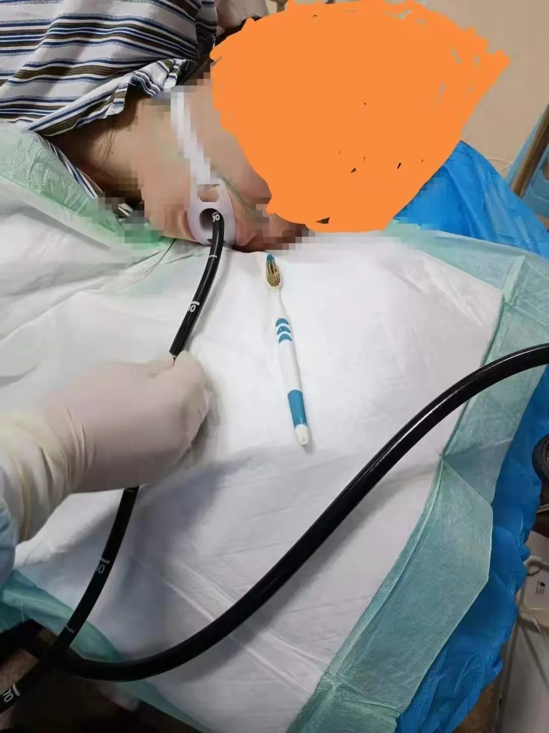 因为牙刷柄比较光滑,想握持稳妥只能横向抓取。但是每一次尝试取出,牙刷就会横着被挡在贲门;如果竖着抓取,又很难抓住。即使抓住也很难将牙刷取出,因为牙刷在胃里的状态是刷柄冲上,如果直接把牙刷拽出来,牙刷头势必对贲门以及食道带来损伤。