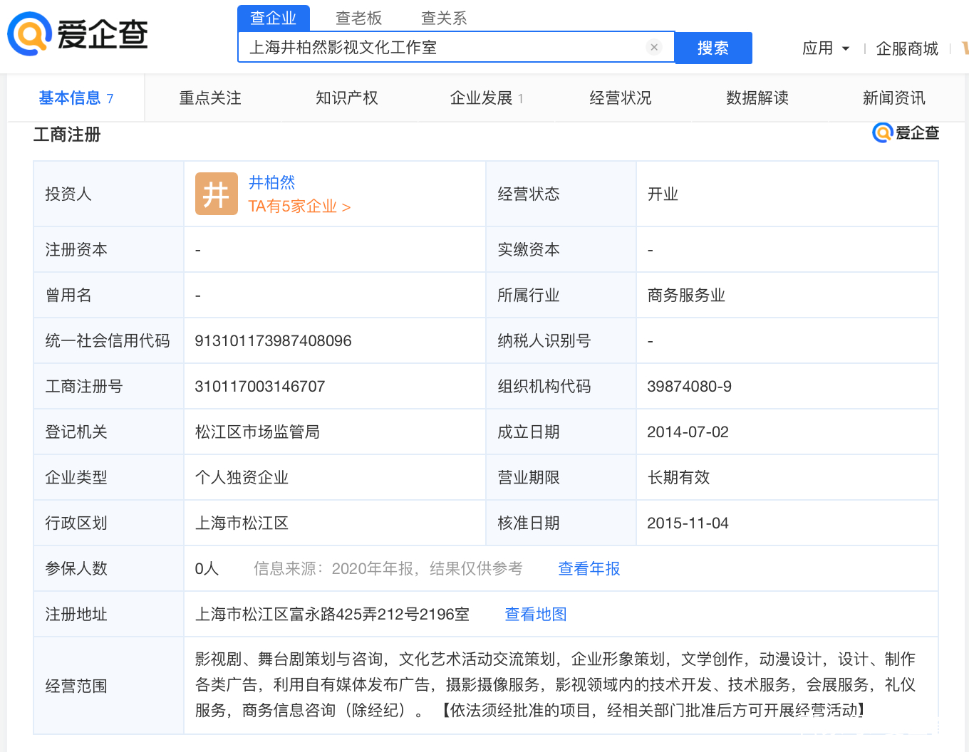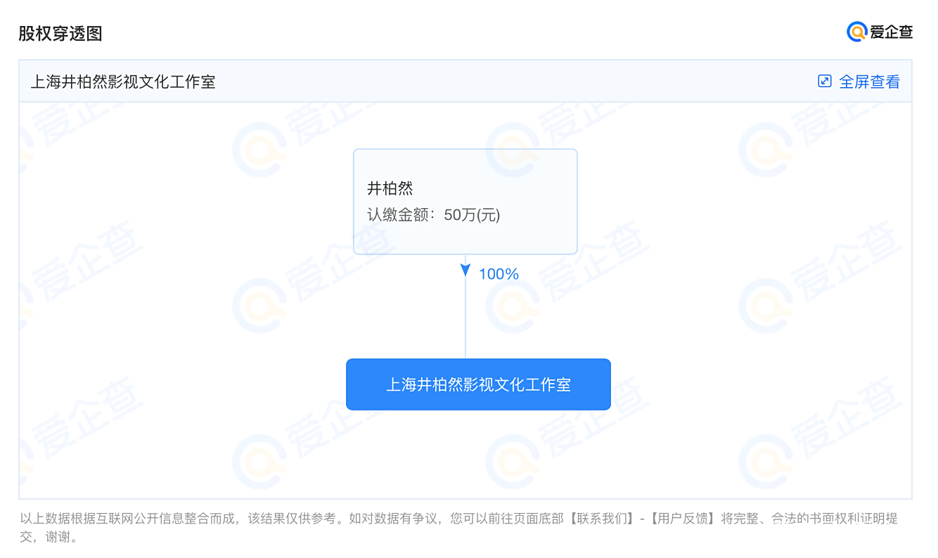 爱企查App信息显示,井柏然工作室关联企业为上海井柏然影视文化工作室,该公司成立于2014年7月,经营范围含影视剧、舞台剧策划与咨询,文化艺术活动交流策划,企业形象策划,文学创作等。作为投资人的井柏然100%持股,为唯一股东,认缴出资50万元。