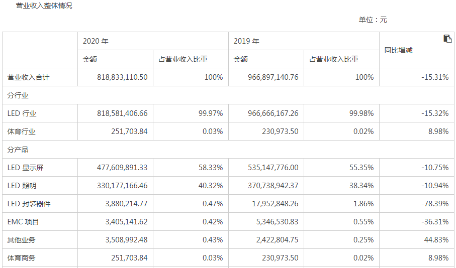 雷曼光电相关人士对界面新闻记者称,公司以前有涉及体育板块的相关业务,但目前这块业务已经大大缩减了。该人士坦言,尽管有政策支持,但实际业务推进还有很多影响因素。界面新闻了解到,雷曼光电目前主要从事LED中下游业务,专注于8K超高清显示产业及照明产业,尤以基于COB封装技术的MicroLED超高清显示产品为主导。2020年年度报告显示,公司去年实现营业收入8.19亿元,亏损3.16亿元;其中,2019年、2020年,公司来自体育行业的收入分别是23.1万元、25.17万元,占总营收比重分别是0.02%、0.03%。