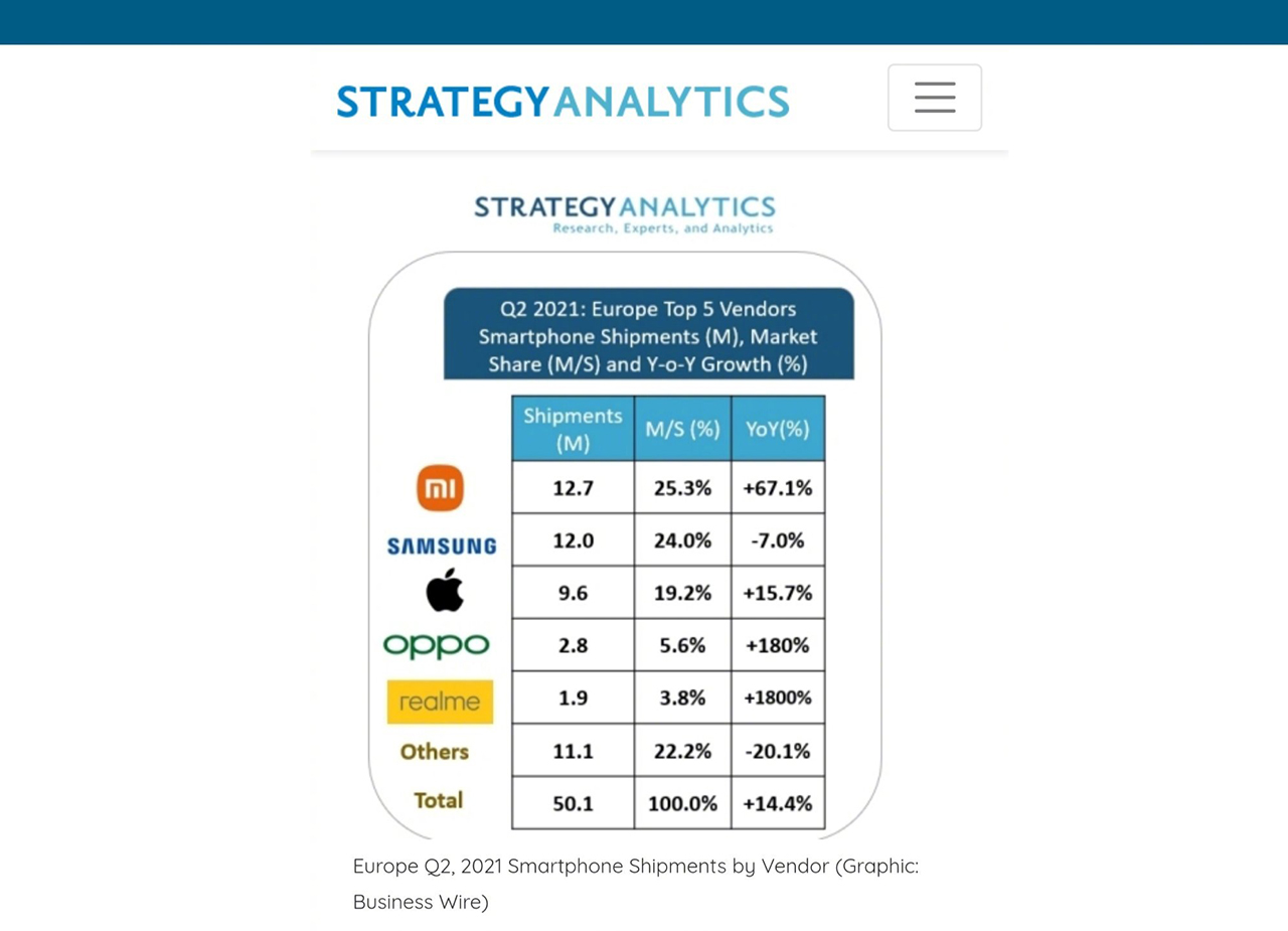 近日,小米集团董事长兼CEO雷军再次公布了一组好消息。根据国际调研机构Strategy Analytics的数据统计,2021年第二季度的欧洲智能手机市场,小米的市场份额已经超过三星和苹果,成为当地第一。具体的出货量为1270万台,实现同比增长67.1%,市场份额25.3%。这样的成绩足以说明小米手机的强势。能够登顶欧洲市场,小米还是很厉害的。