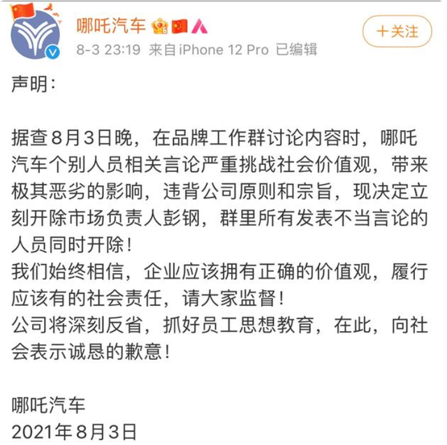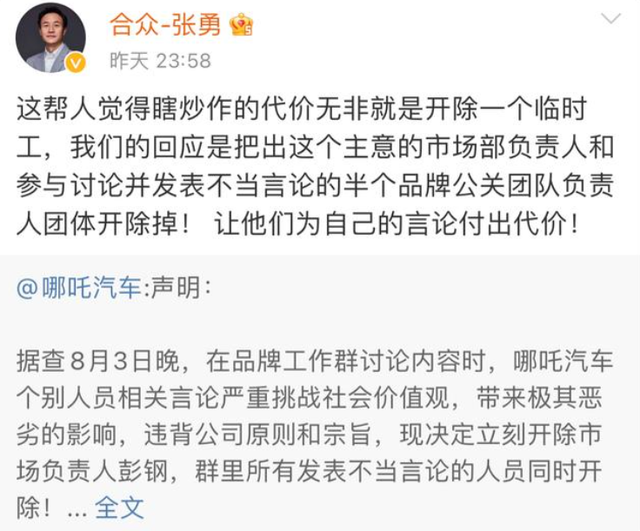 同时哪吒汽车的CEO表示:这帮人觉得瞎炒作的代价无非是开除一个临时工,但我决定将整个公关团队群里的人全部开除,让他们为自己的言论付出代价。毫不犹豫地说这帮人的名声已经臭掉了,即便离职后去其他公司,人家随便一查,知道你这样的公关手段,谁还敢用你呢?