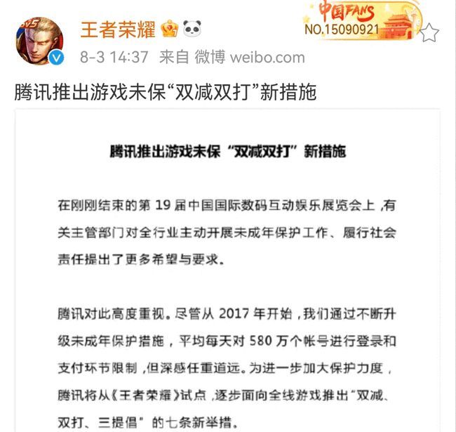 在受到批评后,腾讯进行积极整改,宣布将逐步面向全线游戏推出“双减、双打、三提倡”的七条新举措,而《王者荣耀》将作为试点。