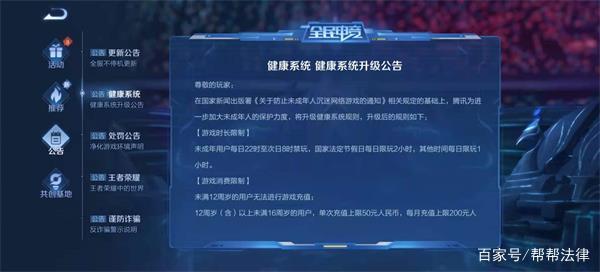 8月4日,《王者荣耀》发布健康系统升级公告,为进一步加大未成年人的保护力度,健康系统将升级,其中,游戏时长方面规定,未成年用户每日22时至次日8时禁玩,国家法定节假日每日限玩2小时,其他时间每日限玩1小时。