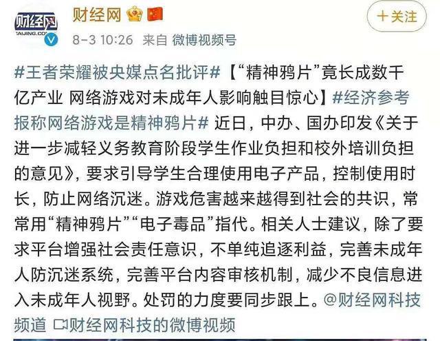 8月3日,由新华社主管主办的《经济参考报》中一篇题为《警惕“精神鸦片”网络游戏危害,及早合理规范》的文章引发网友热议。文章中将网络游戏比作新型“毒品”,并点名批评了《王者荣耀》。当前,未成年人网络沉迷现象普遍,网络游戏对未成年人的健康成长造成不可低估的影响。随着游戏产业发展突飞猛进,对未成年人的吸引力越来越强,使得网络游戏防沉迷难度不断加大。