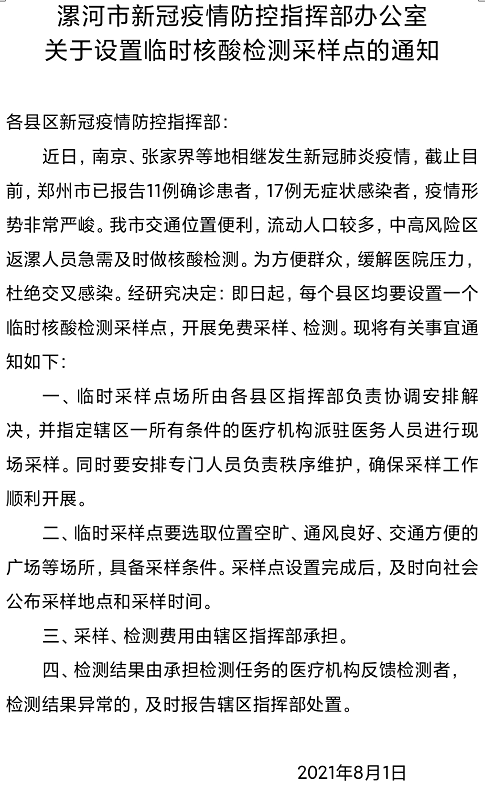 据漯河市新冠疫情防控指挥部办公室通知,为方便群众,各县区均设置了临时核酸检测采样点,已知地点如下: