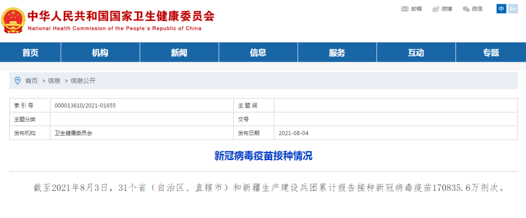 截至2021年8月3日,31个省(自治区、直辖市)和新疆生产建设兵团累计报告接种新冠病毒疫苗170835.6万剂次。