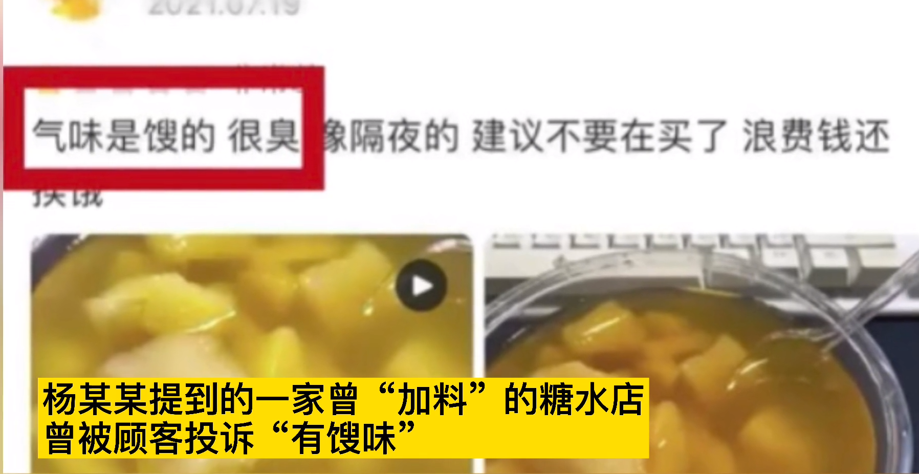 记者查询发现,杨某某提到的一家被其“加料”的糖水店,曾被顾客投诉“有馊味”。