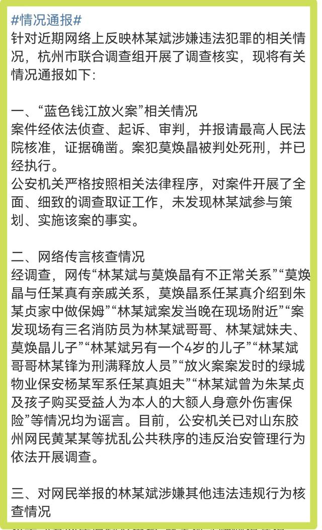 面对网络的种种质疑杭州公安 8月3日在威逼发布关于林生斌涉嫌参与杭州保姆纵火案的最新消息,杭州市联合调查组《关于林生斌相关情况通报》。《关于林生斌相关情况通报》称:未发现林生斌参与策划实施放火案,对于其涉嫌偷税漏税等情况正在调查。