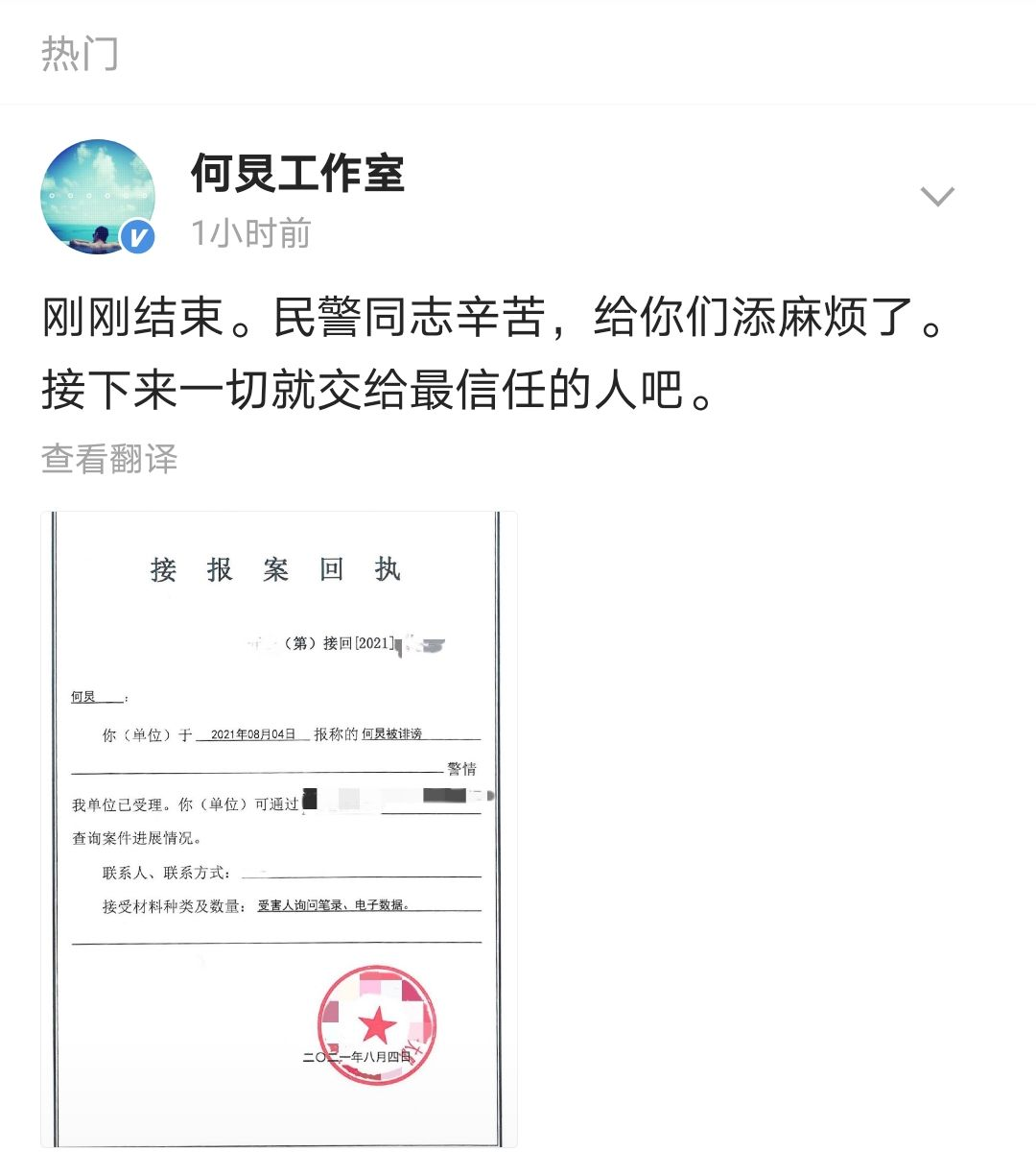 就在刚刚,何炅工作室也报警处理。
