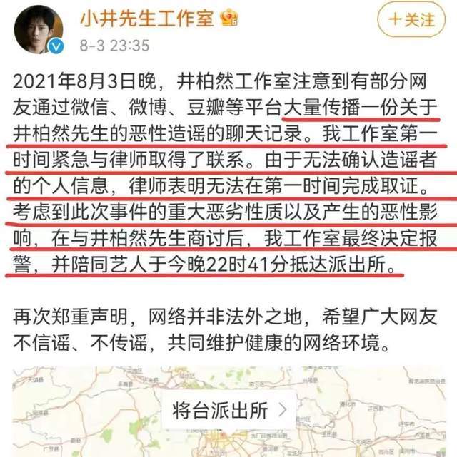 当然,这件事并没有那么简单,除范冰冰以外,网传里不同的版里包含的名单还有井柏然在,随后井柏然工作室同样反应十分迅速,分享了坐标在北京。表示,工作室注意到网络上的造谣聊天记录后,第一时间取得律师的联系。没办法第一时间取证,并在考虑到事情的严重性,直接选择了报警,并在当晚22点41分抵达了派出所。