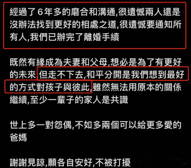 离婚理由十分正经,因为与妻子结婚六年未找到相处之道,无法再继续走下去,与其未来将就成为一对怨偶,还不如好聚好散,给孩子一个更好的生活。