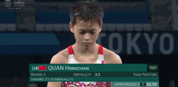 其中,全红婵的第二跳,向内翻腾三周半抱膝,从起跳到入水动作再到入水水花,无可挑剔,所有裁判打出10分,扣掉一个最高分10分,扣掉一个最低分10分,最终得分拉满第二跳收获96分。两轮过后,全红婵以绝对优势排名第一。