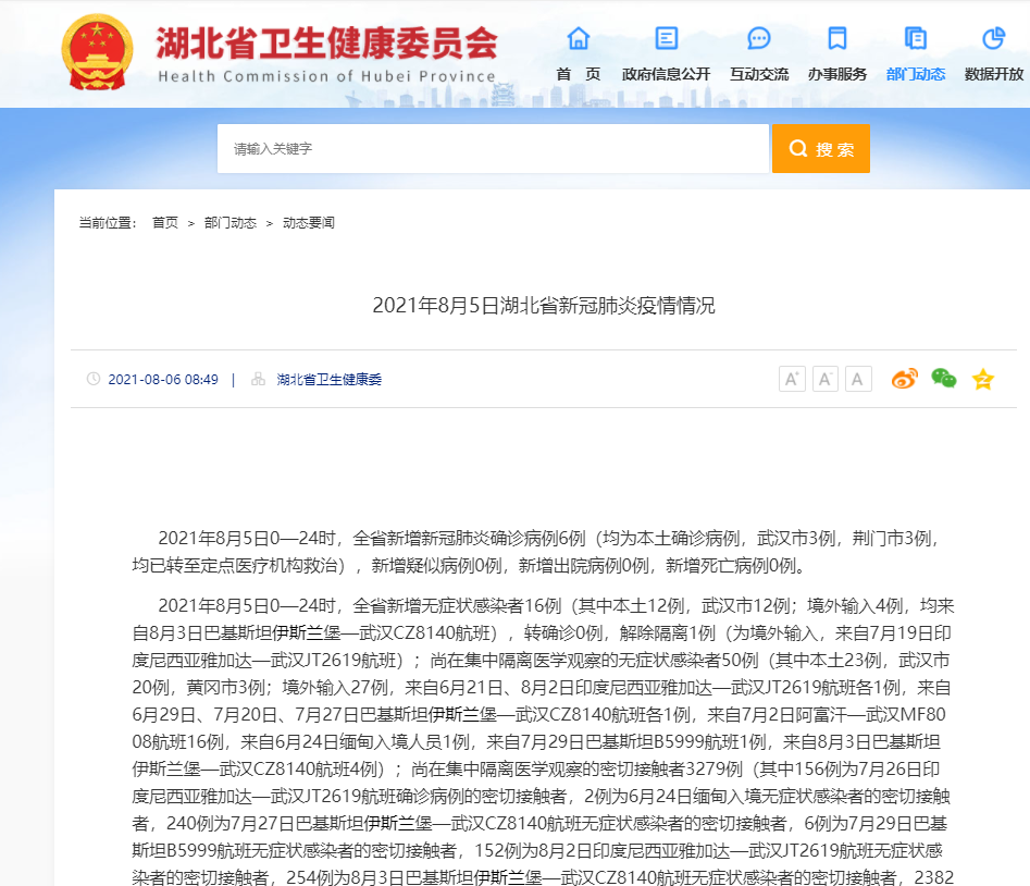 2021年8月5日0—24时,全省新增新冠肺炎确诊病例6例(均为本土确诊病例,武汉市3例,荆门市3例,均已转至定点医疗机构救治),新增疑似病例0例,新增出院病例0例,新增死亡病例0例。
