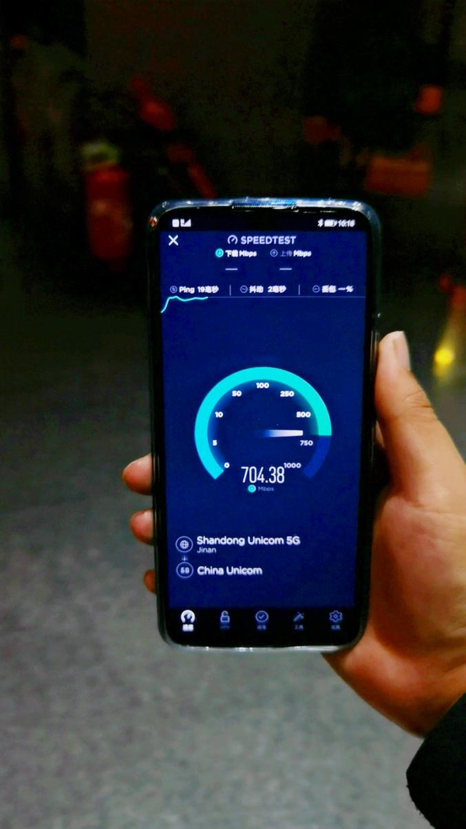 可以看到,在电梯外开启Speedtest后,华为nova 8 SE成功连上了中国联通的5G信号节点并开始测速,达到700Mbps以上,是典型的5G网络测速。